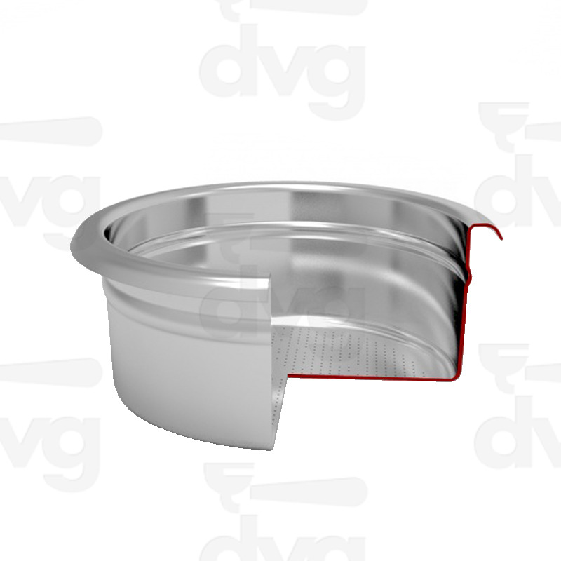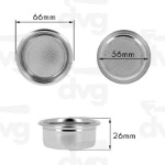Edge D.66mm, Body D.56mm suitable to tamper D.54mm, height 26mm, external ridge 57mm. Perfored area d.44mm, holes d. 0,30mm, high-quality conical drilling, electropolished filter that keeps the surface more shiny, smoother, more stainless. It fits: Dalla Corte, Izzo, La San Marco.