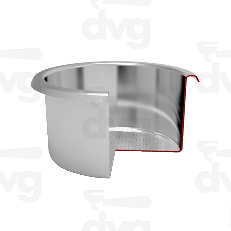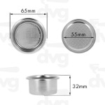 Edge D.65mm, Body D.55mm suitable to tamper D.53mm, height 32mm. Perfored area d.44mm, holes d.0,30mm, high-quality conical drilling, electropolished filter that keeps the surface more shiny, smoother, more stainless. It fits: Astoria (only plus4you), La Spaziale, Wega (only concept)
